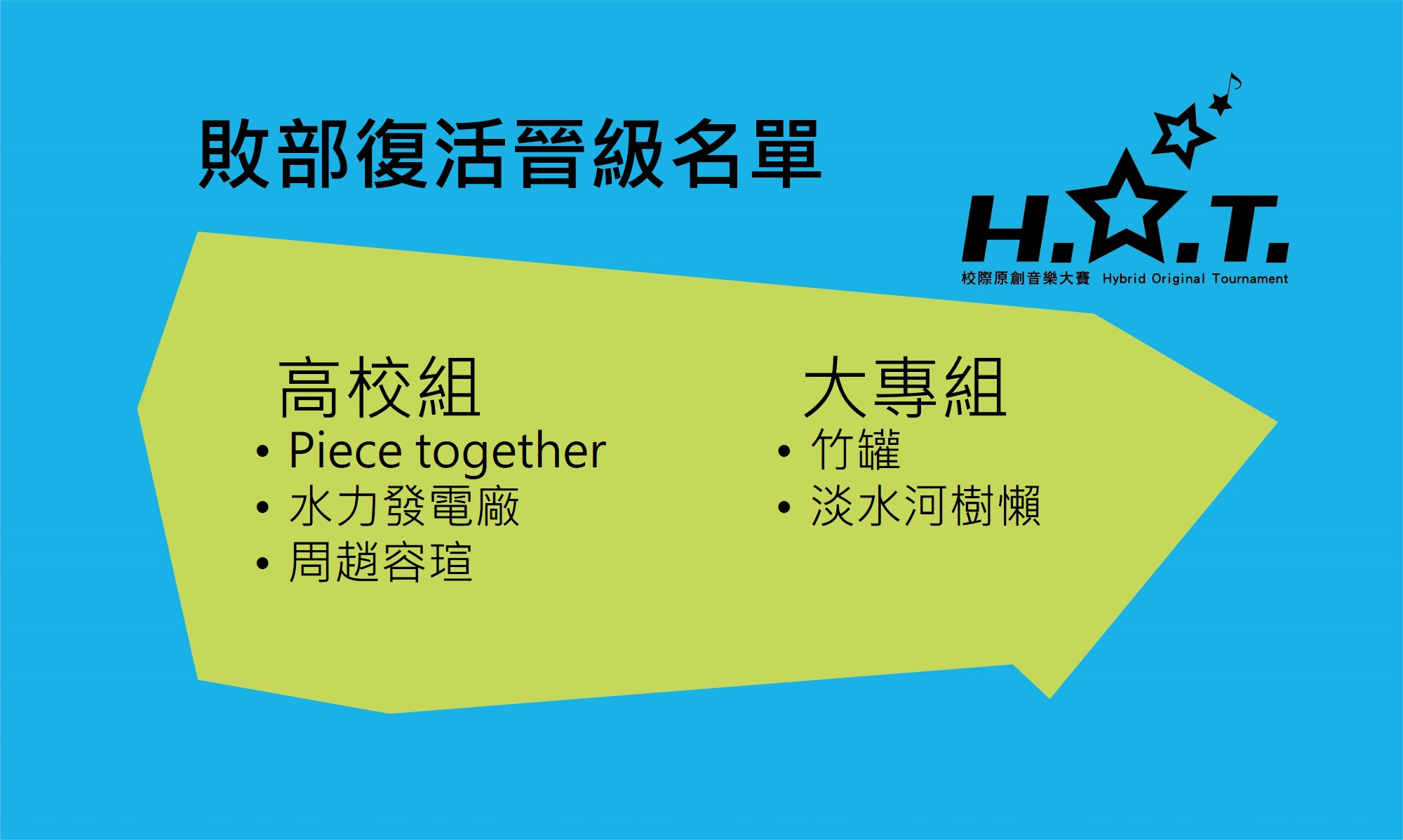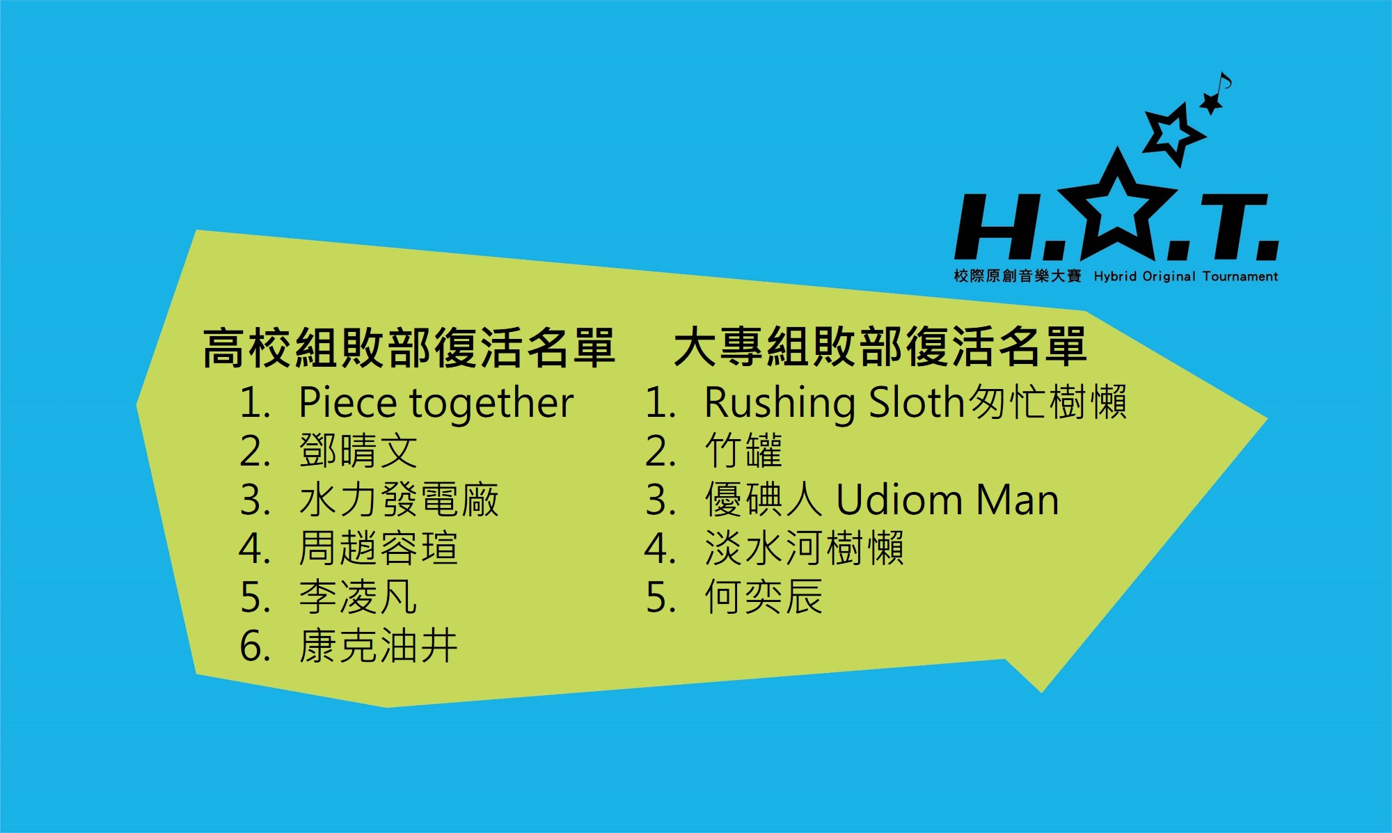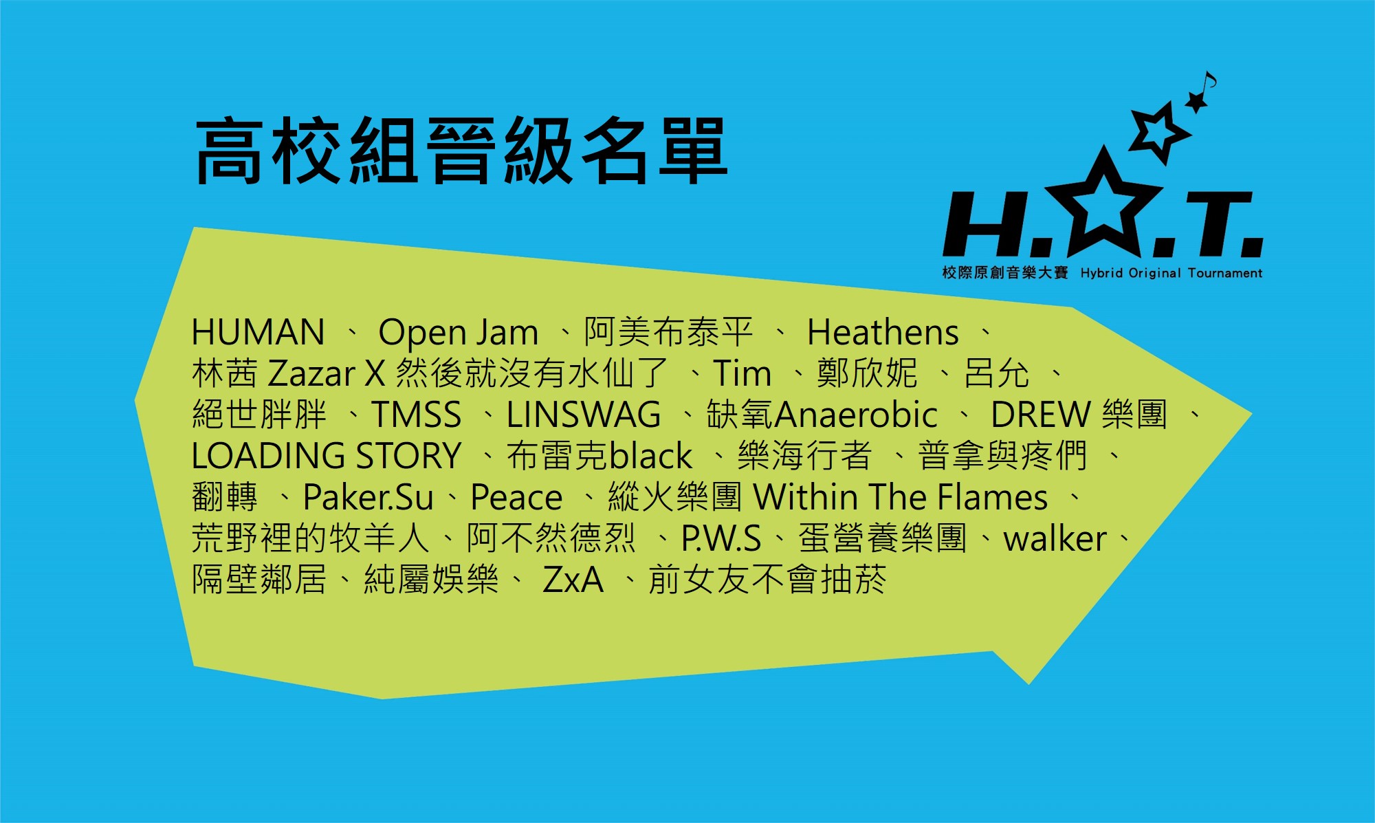恭喜以下樂團晉級複賽 HUMAN 、 Open Jam 、阿美布泰平 、 Heathens 、 林茜 Zazar X 然後就沒有水仙了 、Tim 、鄭欣妮 、呂允 、 絕世胖胖 、TMSS 、LINSWAG 、缺氧Anaerobic 、 DREW 樂團 、LOADING STORY 、布雷克black 、樂海行者 、普拿與疼們 、 翻轉 、Paker.Su、Peace 、縱火樂團 Within The Flames 、 荒野裡的牧羊人、阿不然德烈 、P.W.S、蛋營養樂團、walker、 隔壁鄰居、純屬娛樂、 ZxA 、前女友不會抽菸