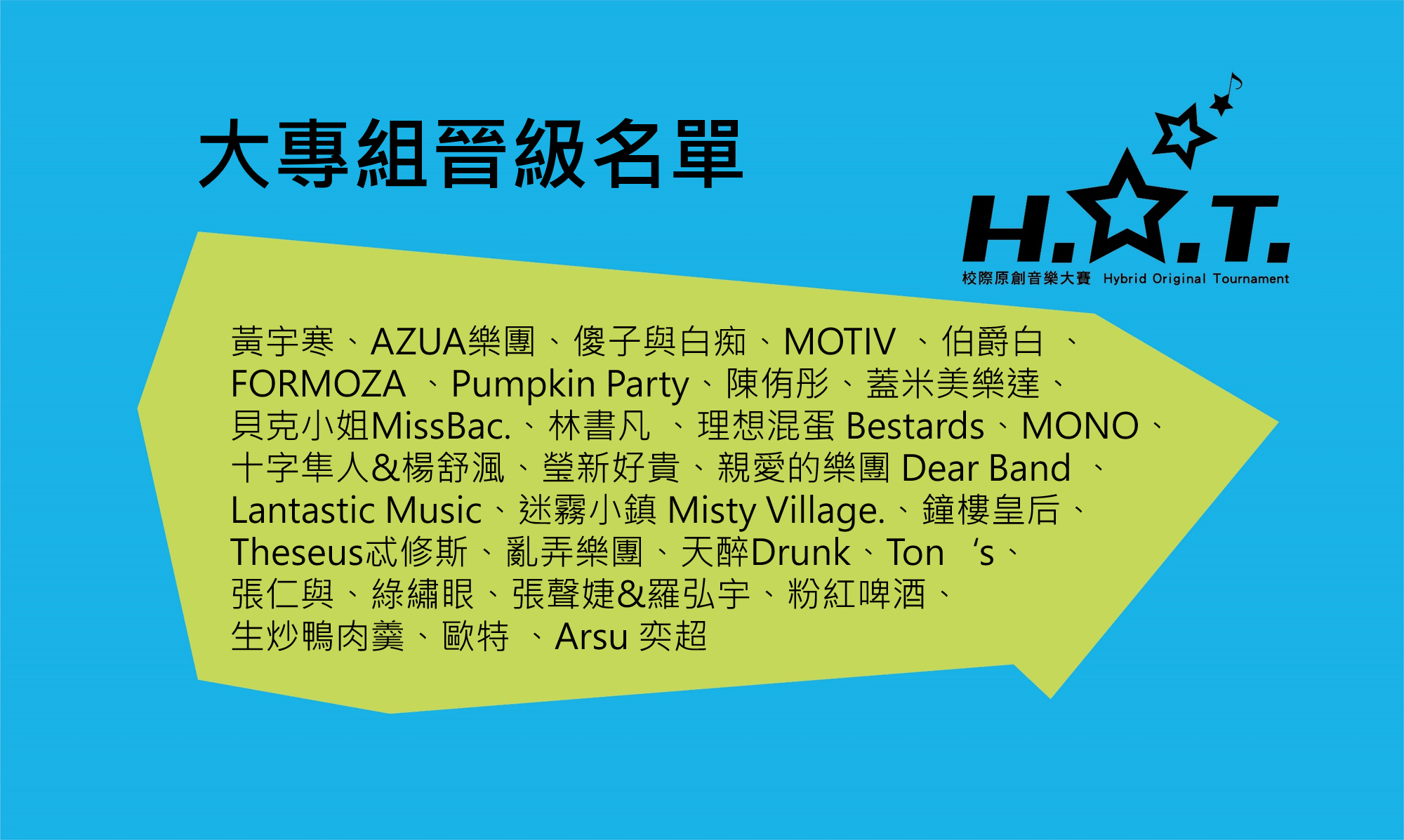 恭喜已下樂團 黃宇寒、AZUA樂團、傻子與白痴、MOTIV 、伯爵白 、 FORMOZA 、Pumpkin Party、陳侑彤、蓋米美樂達、 貝克小姐MissBac.、林書凡 、理想混蛋 Bestards、MONO、 十字隼人&楊舒渢、瑩新好貴、親愛的樂團 Dear Band 、 Lantastic Music、迷霧小鎮 Misty Village.、鐘樓皇后、 Theseus忒修斯、亂弄樂團、天醉Drunk、Ton‘s、 張仁與、綠繡眼、張聲婕&羅弘宇、粉紅啤酒、 生炒鴨肉羹、歐特 、Arsu 奕超